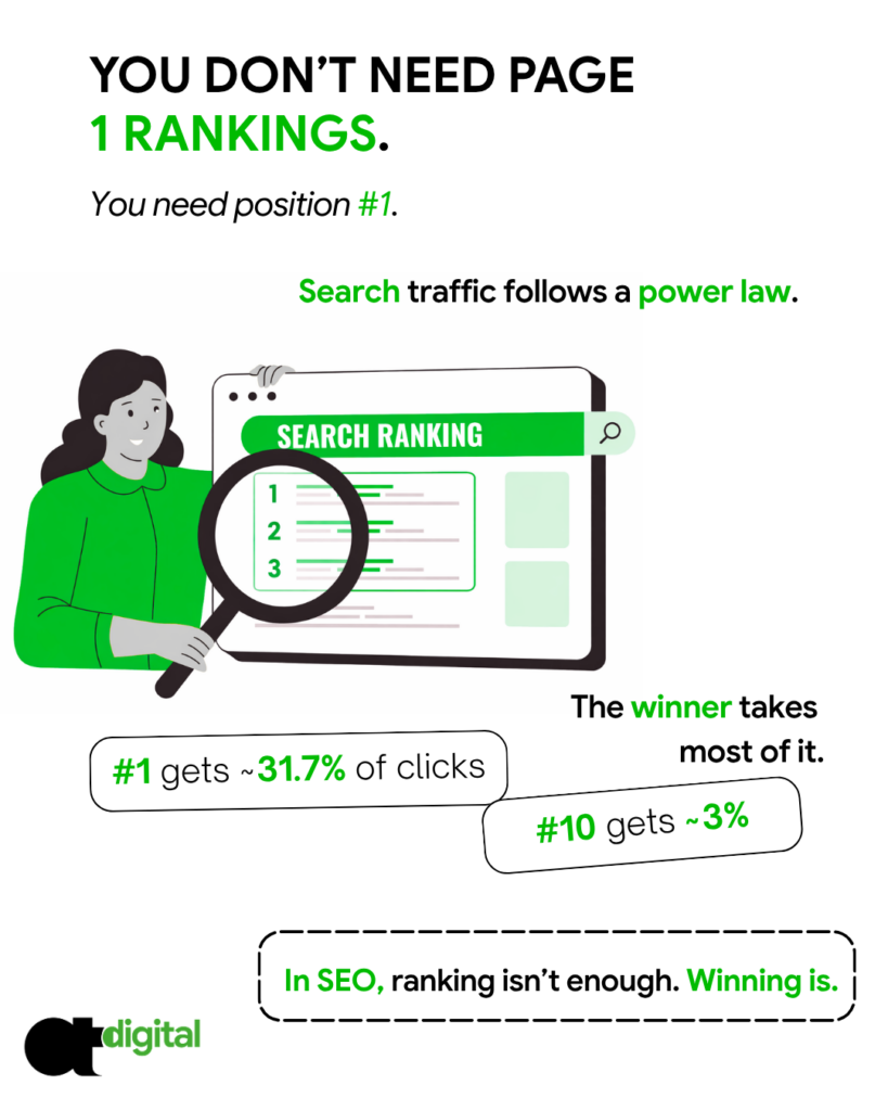 The difference between ranking #1 and ranking #11 (the top of Page 2) is not a gradual decline in traffic. It is a mathematical cliff.