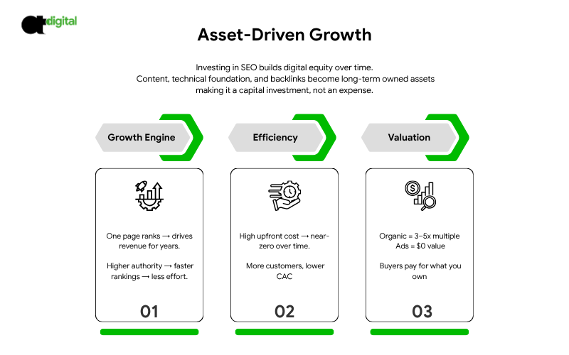 This guide explains why SEO (Search Engine Optimization) is not a marketing expense; it is the only digital channel that lowers your CAC over time and builds permanent Asset Value on your balance sheet.