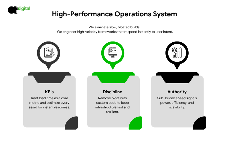 - Technical Discipline: We strip away the digital clutter. By using custom-coded solutions rather than heavy plugins, we ensure your infrastructure remains agile and responsive under high-volume traffic.
