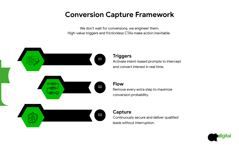 - The Capture Blueprint: We map out the “Best Employee” version of your site, including high-velocity extraction points and automated closing triggers.