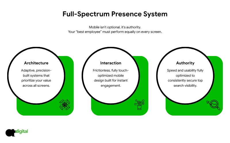 The Visibility Mandate: If you are not visible on mobile, you do not exist in the modern sales cycle. We ensure your digital infrastructure maintains absolute authority on every device, every time.